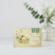 Um doce bebê ladrão está sentado nas violetas. O fundo são pedaços de efemera e cartão-postal vintage com selos brancos e antigos.