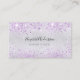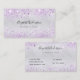 Um cartão de visita elegante e glamouroso em um fundo brilhante de aspecto fino prateado decorado com gota fina de lavanda na frente. Escrito elegante em letras pretas. Personalize e adicione seu nome, título, número de telefone, email e endereço de site.