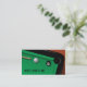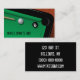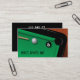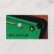 Este cartão de visita caracteriza uma mesa de bilhar com uma bola de sugestão branca, uma bola oito preta, e uma vara de piscina.