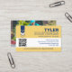 Yellow and blue double sided business card, perfect for a contractor, landscaper or similar, with your name in big letters in blue against yellow. Add your custom QR code on one side and a photo of yourself or the services you offer on the other.