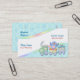 Adorável Cartão de visita apresenta um trem de brinquedo com um bebezinho feliz cavalgando nele. Acentos arco-íris e fundo aqua ligeiramente pontilhado. Padrão correspondente na parte traseira da placa. Texto em frente e verso pronto para personalizar com suas informações. Este cartão funcionaria bem para qualquer negócio relacionado a crianças, por exemplo, creche, babá ou boutique.