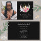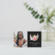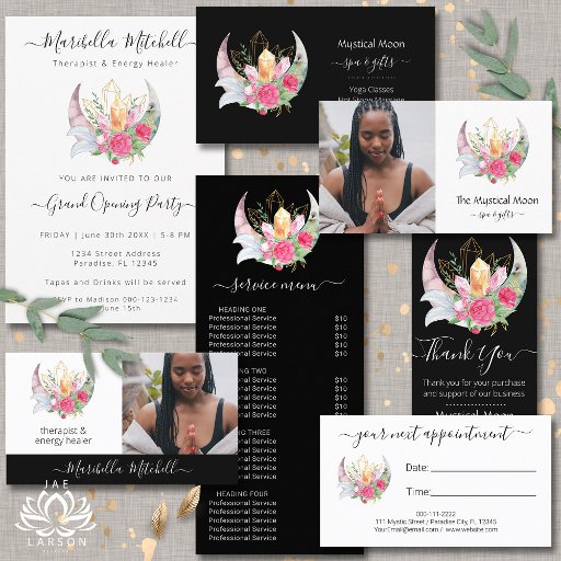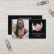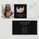 Boho Moon Crystals Penas Fotocartão de visita com fundo preto. Design boêmico com uma lua crescente, pontos de aglomerado de quartzo-rosa e cristais de cítricos, rosas rosa, verde e penas brancas. Perfeito para o seu negócio metafísico, esotérico, spa, terapeuta, curador de energia, clínico e espiritual. Texto pronto para suas informações. Substitua a foto pela sua.