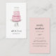 Os cartões de visitas verticais elegantes para a sua padaria, patisserie ou decoração de bolos apresentam uma ilustração de bolo de camada de aquarela em cor rosa e branca, com duas linhas de texto personalizado abaixo para seu nome e nome comercial ou profissão. Adicione suas informações de contato ao lado inverso em um fundo rosa pincelado de pasta açucarada