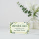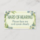 This card features the slogan 'Hard of Hearing' surrounded by a wreath of eucalyptus leaves, on a pale green background. Below it gives specific instructions on how to interact with you. Default is 'please face me and speak clearly.' You can edit the text and colors as needed. 🍃 For more useful deafness stationery, visit my store Zazzle.com/Elder_Vitality 🍃 For custom orders, message me on Zazzle