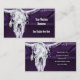 Cartões de visitas horizontais personalizados do crânio de vaca roxo branco-roxo do campo de textura verde-do-campo ocidental. Estilo de safra. O velho oeste selvagem russo inspirou design antigo. Design de animais legal, de moda fazenda. Personalize sua tipografia. Mesma imagem de frente e verso. Imagem copyright Marg Seregelyi Fotografia.