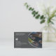 Esse cartão de visita elétrico apresenta as extremidades expostas dos fios coloridos do cabo elétrico. A imagem aparece dentro de uma semisesfera no lado direito da placa. O lado esquerdo da placa apresenta um plano de fundo de cinza. Seu nome, título, logotipo e endereço comercial aparecem nesta cinza.