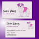 Um cartão de visita com um moderno tom rosa e roxo desenhando um cachorro fofo. Perfeito para um serviço de ambulantes de cães ou babá de estimação.