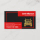 A coluna da caixa no topo abriga seu nome prestigioso e seu título de trabalho. Logo abaixo está um logotipo de caminhão dourado que você pode usar. A caixa vermelha abaixo tem os detalhes de contato e uma legenda de slogan para que você divulgue seus serviços. Mude a legenda "caminhão para aluguer" para atender às suas necessidades de serviço.