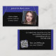 Cartão de visita elegante para cantores de ópera, vocalistas clássicos, artistas de teatro musical e tutores de música, em preto elegante com efeito de cortinas azuis palcos. A frente pode ser personalizada com seu nome, foto e ocupação, enquanto a parte traseira apresenta um código QR para você dirigir para seu próprio site, assim como espaço para mais informações e seus detalhes de contato.