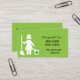 Esta é uma legal cartão de visita de fundo verde para limpeza de casas e escritórios, com uma empregada segurando uma vassoura e balde com um impressão de coração verde giro. Seu nome, títulos e número de telefone vão de um lado e seu e-mail e site vão do outro lado.