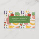 Apanhar cartão de visita com um padrão de ferramentas de comida e cozinha, como maçãs, manjericão, uísques, facas, conselhos de corte, queijo, bananas e mais em cores suaves e um retrato divertido procurar um negócio de restauração, um chef pessoal ou similar.