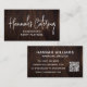 Na moda Modern Simple Wood Elegant Script Catering Party - Cartões de visitas do Partido Catering da Mancha Simples com uma simples na moda com um conselho de corte de cozinha marrom com uma sobreposição de seu nome, empresa, tipo de negócio, designação ou informações adicionais na frente. No verso estão os seus dados de contato personalizados, os detalhes das mídias sociais e o Código QR personalizado. Perfeito para uma grande variedade de marketing de negócios, desde o manuseio e a construção até a restauração. Personalize editando o texto nas caixas de texto fornecidas. Elaborado por ©Evco Studio www.zazzle.com/store/evcostudio