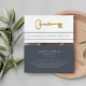 Os cartões de visitas elegantes para inspetores domésticos ou empresas de inspeção ao domicílio apresentam uma ilustração de chave de safra com seu nome ou nome comercial abaixo. Adicione seus detalhes de contato do cheio ao lado inverso em branco em um fundo azul do enfumaçado em contraste.