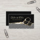 Um moderno cartão de visita de salão de cabelos preto e branco, que apresenta um par de tesouras de corte de cabelo douradas, faz um padrão em preto e branco. Perfeito para a indústria de cabelos e beleza. Personalize acrescentando o nome do penteado ou do embelezador certificado.