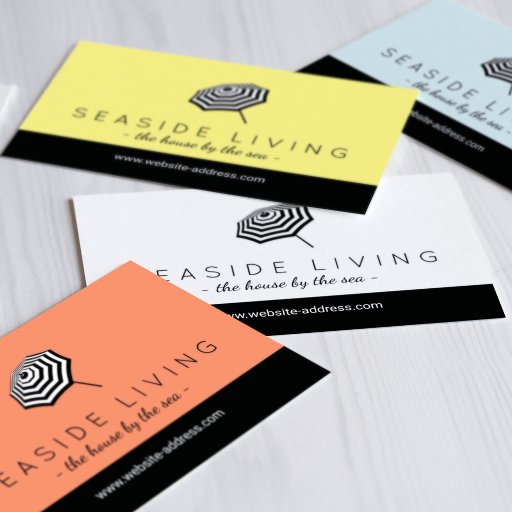 Um guarda-chuva de praia em branco e preto é emparelhado com seu nome ou nome comercial para um logotipo instantâneo neste modelo de cartão de negócios de designer. Projetado para capturar a essência do luxo em um design simplista. Perfeito para cafés, aluguéis de praia de férias, boutiques, designers de interiores, salões de bronzeamento por spray e muito mais. Arte e design © 1201AM Design Studio | www.1201am.com
