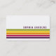 Um modelo de cartão de negócios com um motivo de faixa horizontal de cinco cores na frente com as mesmas faixas em execução vertical na parte traseira e alinhadas à esquerda. Nome na frente em letras de espaço duplo. O nome também é repetido no verso com o título/cargo e os detalhes de contato abaixo. Este modelo de cartão foi concebido principalmente para um indivíduo ou um freelancer que pode, evidentemente, ser mais personalizado e pode ser facilmente adaptado para outras utilizações.