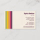 Um modelo de cartão de negócios com um motivo de faixa horizontal de cinco cores na frente com as mesmas faixas em execução vertical na parte traseira e alinhadas à esquerda. Nome na frente em letras de espaço duplo. O nome também é repetido no verso com o título/cargo e os detalhes de contato abaixo. Este modelo de cartão foi concebido principalmente para um indivíduo ou um freelancer que pode, evidentemente, ser mais personalizado e pode ser facilmente adaptado para outras utilizações.