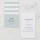 O design cartão de visita moderno e chic em um formato vertical exclusivo apresenta três grandes faixas brancas em um fundo azul-verde pastel spa, com seu nome e nome comercial ou título em uma mistura atraente de serifas minúsculas e tipos de bonés modernos. Adicione as informações de contato do cheio à parte traseira em azul rico marinho. Adequado para qualquer profissão; exemplo apresentado para instrutores de malhação.