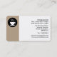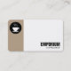 Um modelo de cartão de negócios criado à indústria da restauração em mente. Uma margem de cor de 1 à esquerda com um círculo preto sólido com um símbolo/logotipo da xícara de café (que também pode ser substituído pelo seu próprio logotipo) Nome da empresa e tipo de negócio organizado na parte inferior direita. O verso da placa tem o mesmo esquema, juntamente com uma repetição do logótipo. As horas de abertura e outros contatos estão alinhados à direita. N.B Esta modelo não tem um nome de contato e um cargo, pois é projetada para funcionar mais como um minicardia para uma preferencialmente de café ou restaurante do que para um representante individual ou de uma empresa. Esse modelo simples, mas versátil, está pronto para ser personalizado com seus detalhes ou pode ser personalizado adicionalmente.