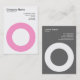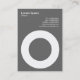 Um modelo de cartão de negócios com um círculo vago ou símbolo 'O' na frente. Nome da empresa, tipo de negócio e endereço na frente com nome, cargo, telefone, web e endereços de e-mail no verso, com um layout semelhante em um fundo de cinza com uma repetição do símbolo frontal em branco. Este cartão também pode ser mais personalizado.