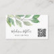 Este cartão de visita de verde moderno é perfeito para um proprietário de pequenas empresas, consultor, estilista e muito mais. O design botânico apresenta folhas aquáticas em tons de tipografia verde e na moda. Facilmente personalizável com seus detalhes e código QR. Use a Ferramenta Design para alterar o tamanho, o estilo ou a cor do texto. Original Watercolor © Michele Davies.