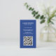 Cartão de visita vertical moderno com um estilo simples e minimalista com o seu Código QR na frente e os ícones das mídias sociais no verso. Todos os elementos de design estão em branco sobre um fundo azul. Um design simples e mínimo que pode ser personalizado para qualquer profissional de negócios.