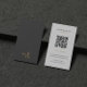 Serviços minimalistas e elegantes de corte de cabelo, com texto simples de ouro e cinza e tesouras simples em fundo reversível, cinza e branco. Código QR Moder.
