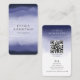 Design de cartão de visita de de aquarela moderna com marinho de gradiente com fundo aquarela azul, tipografia elegante e espaço para seu código QR personalizado. Crie cartões de visitas de código QR digitalizáveis profissionais para seu design, fotografia, beleza ou qualquer outra empresa usando este modelo de cartão chamador de escova azul escura. Você pode adicionar qualquer link ao código QR para promover suas contas de mídia social, site ou uma oferta especial.