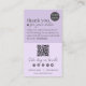 Cartões de agradecimentos de Código QR para Empresas de Script Mínimo e Moderno Roxo Adiciona este cartões de agradecimentos de na moda às suas encomendas de clientes para um toque quente. Mostre sua apreciação e esclareça sua embalagem com um design púrpura macio e uma inscrição moderna. Personalize-o, incluindo um código de cupão especial para encorajar compras repetidas. Adicione seu logotipo e perfis de mídia social para ajudar os clientes a permanecerem conectados. Inclua seu link de site no código QR para facilitar o acesso. Ajude a criar relações fortes com os clientes e torne a sua marca memorável.