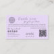 Cartões de agradecimentos de Código QR para Empresas de Script Mínimo e Moderno Roxo Adiciona este cartões de agradecimentos de na moda às suas encomendas de clientes para um toque quente. Mostre sua apreciação e esclareça sua embalagem com um design púrpura macio e uma inscrição moderna. Personalize-o, incluindo um código de cupão especial para encorajar compras repetidas. Adicione seu logotipo e perfis de mídia social para ajudar os clientes a permanecerem conectados. Inclua seu link de site no código QR para facilitar o acesso. Ajude a criar relações fortes com os clientes e torne a sua marca memorável.
