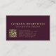Esta cartão de visita moderna mostra uma imagem de fundo de uma parede de tijolos escuros e burguentos. Personalize-o com o seu nome em fontes de serifa douradas e suas informações comerciais em fontes sans serif. A parte traseira da placa apresenta texto dourado em um sólido fundo burgundy escuro, junto com um código QR que direciona os clientes para o site da sua empresa.