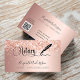 Um cartão de visita elegante e glamouroso sobre um fundo rosa dourado decorado com confete na frente e uma caneta de assinatura preta. Escrito elegante com letra manual. Personalize e adicione seu nome, título, informações de contato e seu próprio código QR ao seu endereço de site.