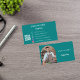 Um fundo cor verde e lacrimejante. Personalize e adicione seu título, nome/nome comercial e texto na frente. Texto branco. Um quadro fotográfico em forma de arco. Anterior: Modelos para o seu nome, título, número de telefone, correio e endereço do Web site, o seu próprio código QR para o Web site ou conta de suporte social. Ícones/conta do Facebook e Instagram.