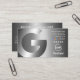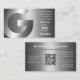 Apresentação de um cartão de visita metálico prateado adaptado às pequenas empresas ou indivíduos com perfil Google Business. O lado frontal apresenta o logotipo distintivo do Google G posicionado elegantemente à esquerda da placa.