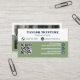 Cartões de visitas duplos em verde-oliva, azul-marinho e branco com ícones profissionais para suas informações de contato, presença nas mídias sociais e site. Adicione um código de QR prático que conduza ao seu site ou página de perfil. Seu nome em uma fonte azul marinho em negrito no topo. Do outro lado, adicione uma foto de você mesmo, seus serviços, sua empresa ou qualquer outra coisa que você precise. Um cartão de visita prático e profissional para ele com uma combinação de cores de captura visual de azul marinho e verde-azeitona personalizada com nome, slogan, informações de contato e código QR.