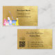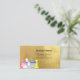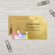 Um cartão de visita elegante e glamouroso sobre um fundo falso de aspecto dourado decorado com equipamento de limpeza. Personalize e adicione seu nome, informações de contato de texto e seu próprio código QR ao seu endereço de site.