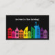 Design brilhante, ousado e moderno para todos vocês motoristas profissionais que estão navegando no caos das pessoas por toda parte. Cartão preto clássico com um horizonte colorido da cidade do arco-íris e seu slogan na frente. Personalize facilmente com suas informações e o Código QR no verso.