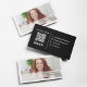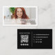 Um simples design apresenta um modelo de cartão de negócios de código QR, com uma fotografia simples, e um estilo profissional moderno, com um código de barras digitalizável para um site ou mídia social, um design de chic minimalista e moderado, com detalhes mínimos de contato, e um fundo preto e branco no verso, um cartão de visita de cobertura de texto de fotografia.