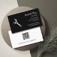 Código QR moderno - cartão de visita simples de cabelos estilista, com design de tesoura branca e fundo preto. Com a inscrição personalizável em preto-e-branco, você pode adicionar suas próprias informações. Uma na moda para promover seu salão de cabelo ou negócio de beleza.