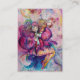 Corneta colorida, branca, rosa-rosa engraçada, tocando coruja com uma coruja expressiva e notas musicais alegres, flores, folhas em vermelho vibrante, fúcsia, violeta, roxo, azul, cores brancas, pintura aquarela de Búlgaro Lumini (c)