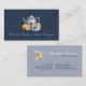 Cartão de visita azul empoeirado, rico e empoeirado, com um velho bule de chá elegante, azul e branco, com limões amarelos frescos. Este exemplo é criado a ajustado de um compro ou colecionador antigo, mas pode ser tão charmoso para um café ou teahouse aconchegante, assim como estilistas de interiores, padarias artísticas, compras caseiras e jardins, ou até mesmo uma cama cheia de personagens e o café da manhã.