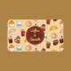 Este design de design apresenta diferentes comidas como fria, xícara de café, produtos cozidos, etc. a parte de trás do cartão também tem uma caneca de café com café à volta do texto.
