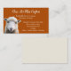 Cartões de visitas de carneiro para a loja de fios, o compro de artesanatos, as artes de fibra, os designers de tricô, os artefactos de fios. Uma ovelha/cordeiro sai do canto dos cartões cor-de-laranja ferrugem com texto branco. Personalize para suas necessidades com o script em negrito no topo e mais duas seções de texto que podem conter qualquer informação. Escolha uma cor com fundo escuro e texto claro ou claro com escuro.