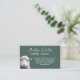 Cartão de visita de fibra com imagem de carneiro no canto. Cor escura, verde florestal com texto verde-cinza pálido. Nome, ou negócio no topo com letra manuscrita. Uma linha abaixo para ocupação ou serviço. Todas as outras informações, como contato, sítio Web, endereço, são acrescentadas no formulário de parágrafo. O reverso é verde-claro e sólido.