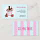 Ilustração bonita e desenhada à mão de um copo de sorvete de morango com palitos de chocolate e rodeada de morangos em círculo branco. O fundo é um azul fresco de menta. Seu nome de compro está escrito em uma tipografia rosa-giratória. Suas datas são escritas em uma tipografia simples correspondente. A parte de trás mostra listras em rosa e azul. Você tem a possibilidade de escrever uma nota para seus clientes.