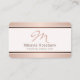 © Sunny Mars Designs. Modelo de cartão de negócios Monograma Profissional de Script Dourado rosa - cartões de visitas clássicos modernos com ouro rosa falso elegante e faixas metálicas marrons e um monograma de manchas rosa com cor contra fundo de rosa claro mole.