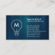 Monograma Elétrico cartão de visita de contratante apresenta um ícone de lâmpada sobre uma textura metálica azul falsa. Perfeito para elétrico, elétrico, contratante elétrico, eletricidade, contratante, trabalhador, trabalhador, reparação de casas, reparação de casas.