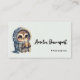 Cartões de visitas com uma ilustração kawaii de uma coruja de olhos grandes em um roupão de inverno e cachecol segurando um café quente.