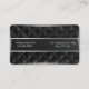O cartão apresenta uma imagem de fundo do couro natural preto com costura em forma de diamante. No centro há uma faixa vertical em preto e prata para o texto. A parte traseira da placa exibe uma imagem indefinida, adicionando uma sensação de intrigação. Há uma inserção preta no centro para informações de contato. Esta carta reflete elegância e estilo, incorporando o couro natural preto e acentuado em cores pretas e prateadas.