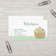 O cartão de visita para negócios, serviços de puericultura, etc. bebê-relacionados caracteriza a cesta de vime do presente com coisas do bebê e o bebê com beira verde da parte inferior do weave de cesta.
